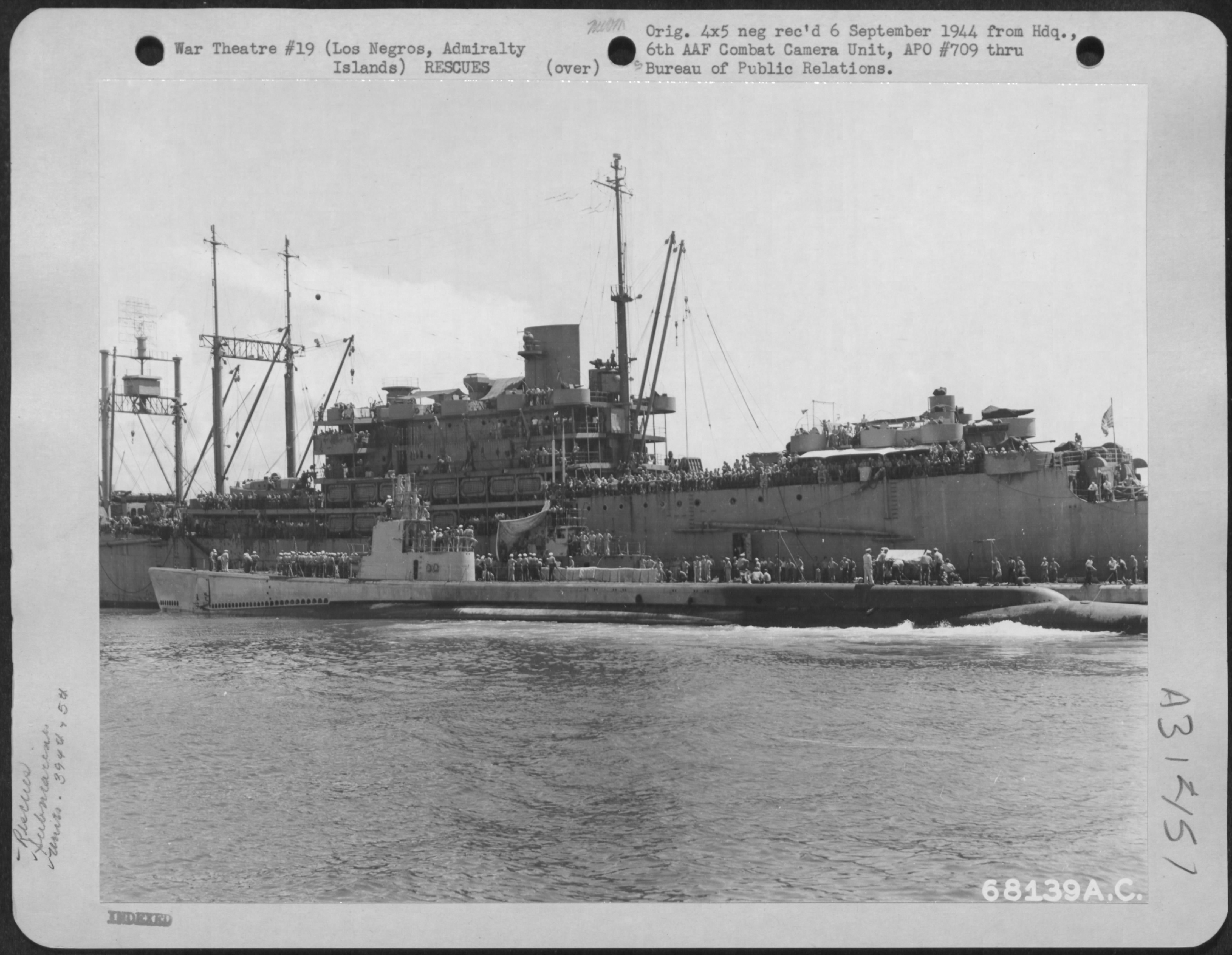 On July 19, 1944 B-24's from the 5th Bomb Group bombed Yap Island. The lead plane of the 394th squadron was flown by Captain Dick Longino. The bomb run was made at 13,500 feet and no Japanese AA fire was observed. About five minutes after bombs away, five Japanese fighters were observed attempting frontal attacks on the bombers. Capt. Longino noticed a fire between his number 1 and number 2 engines. His B-24 began to descend. They asked for a bearing towards the rescue submarine but were forced to abandon the plane as the fire became more intense. Other B-24's circled over the downed crew members in the water and they dropped rafts. The rescue submarine was not far away and amazingly was able to locate and rescue eight of the ten crew members throughout the day and the next day, July 20th. The following pictures were taken when the submarine, the USS Guivina, returned the men to their base on the Admiralty Islands.