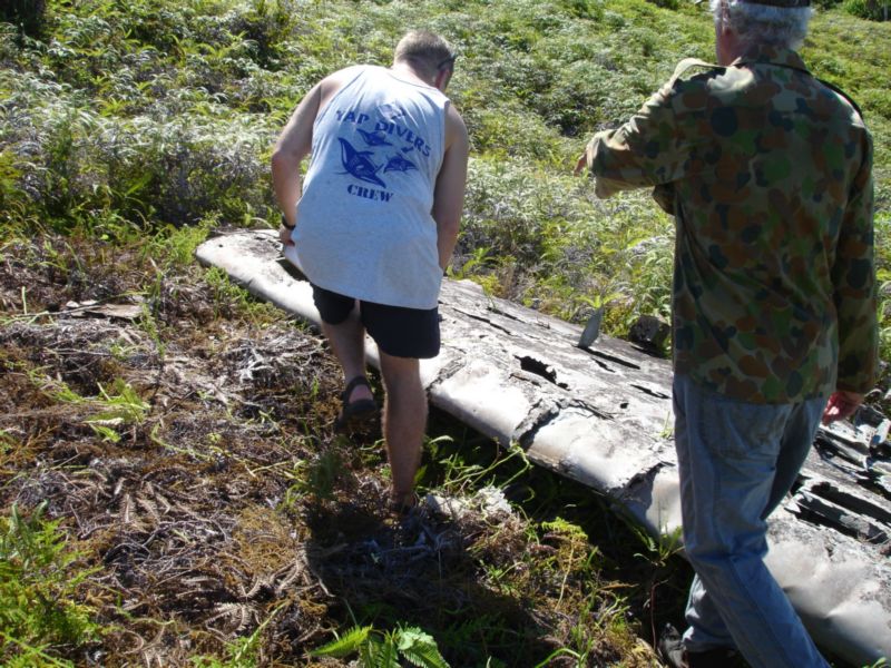 The following pictures were taken of the wing wreckage that was found from a VMTB-232 TBM-3 Avenger that crashed on Yap Island on March 16, 1945. The wreckage was found on the northeast side of the old Japanese airstrip. The wing was originally located last year by Stan Gajda and the Yapese family that owns the land. Stan was on Yap and sponsored by the History Flight organization to help with the first few days of our 2008 trip. The Yapese had always assumed it was wreckage from a Japanese plane since the area is littered with Japanese plane wreckage. About 40 feet from the wing is the fuselage and wheels from a Japanese Zero fighter. Stan led us back to the wing and with his help it was clearly identified as the left wing of the TBM-3 that crashed on March 16, 1945. Stan spent two days searching the area for the rest of the wreckage without success. We spent an afternoon going through the jungle around the airstrip trying to sort through the Japanese wreckage for any American parts without success. The wreckage is likely located inside a swampy area near the wing, however, this area is difficult to walk through. The Yapese plan to spend more time helping us search this area to locate the rest of the plane wreckage that was photographed at the end of the war when the grave sites were recovered.
